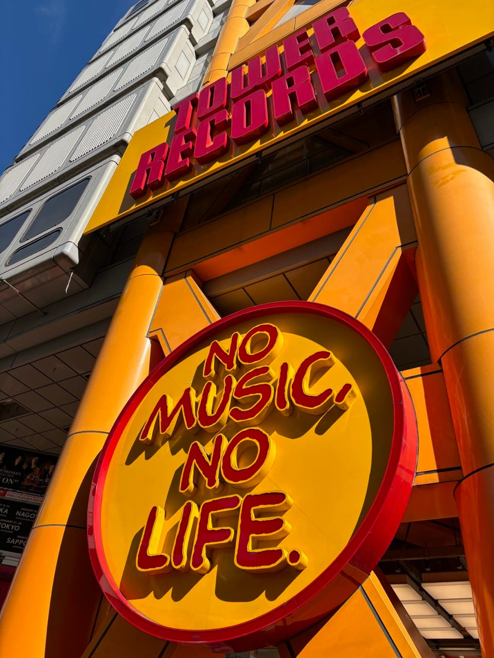 Em frente a Tower Records localizada em Shibuya tem uma placa com o logo da marca: "NO MUSIC, NO LIFE." ("Sem música, sem vida." numa tradução literal). Não tenho certeza se todas as outras lojas da Tower Records aqui em Tokyo tem essa placa, mas achei icônico.